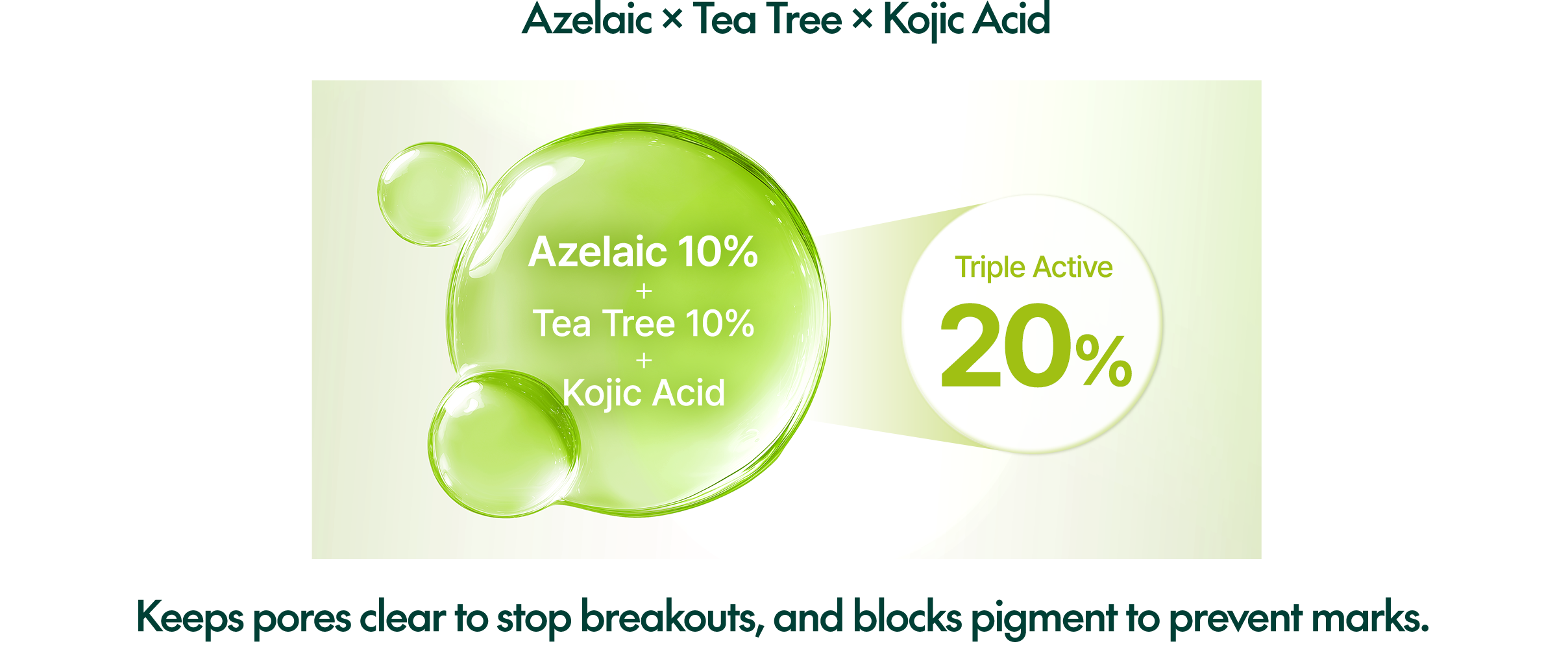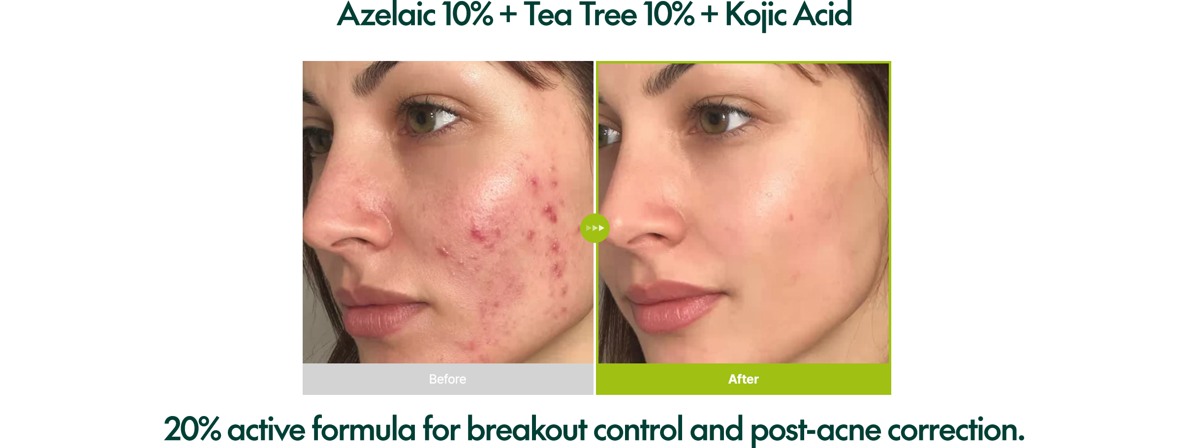 - فرمول فعال ۲۰%: این سرم با ترکیبی از آزلائیک اسید، کوجیک اسید و روغن درخت چای، اثربخشی بالایی در کنترل جوشها و بهبود ظاهر پوست دارد.